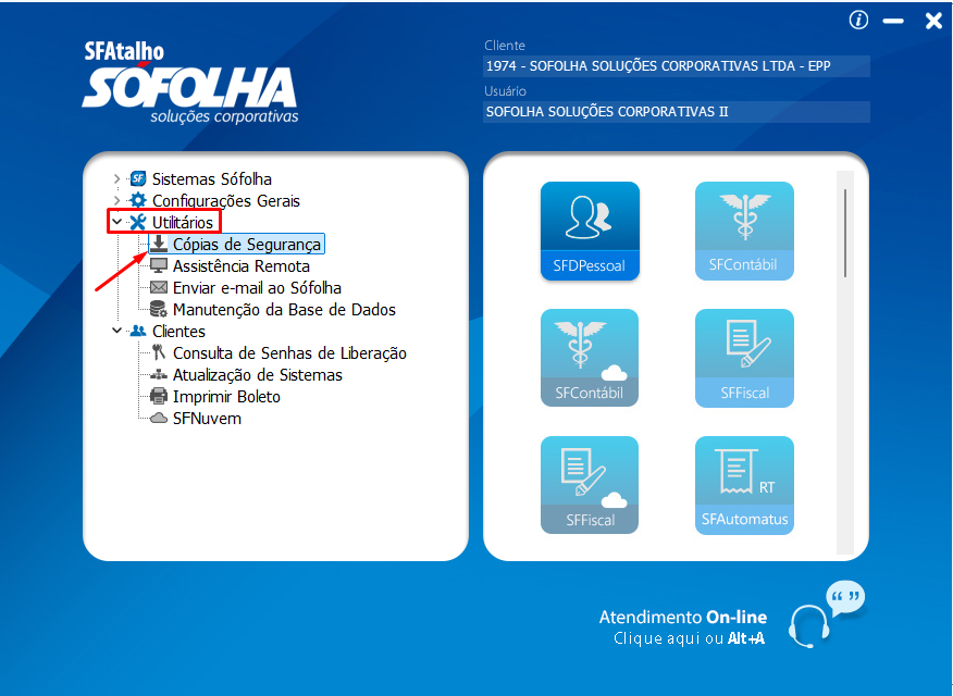 1. No SFAtalho, clique em Utilitários > Cópias de Segurança;