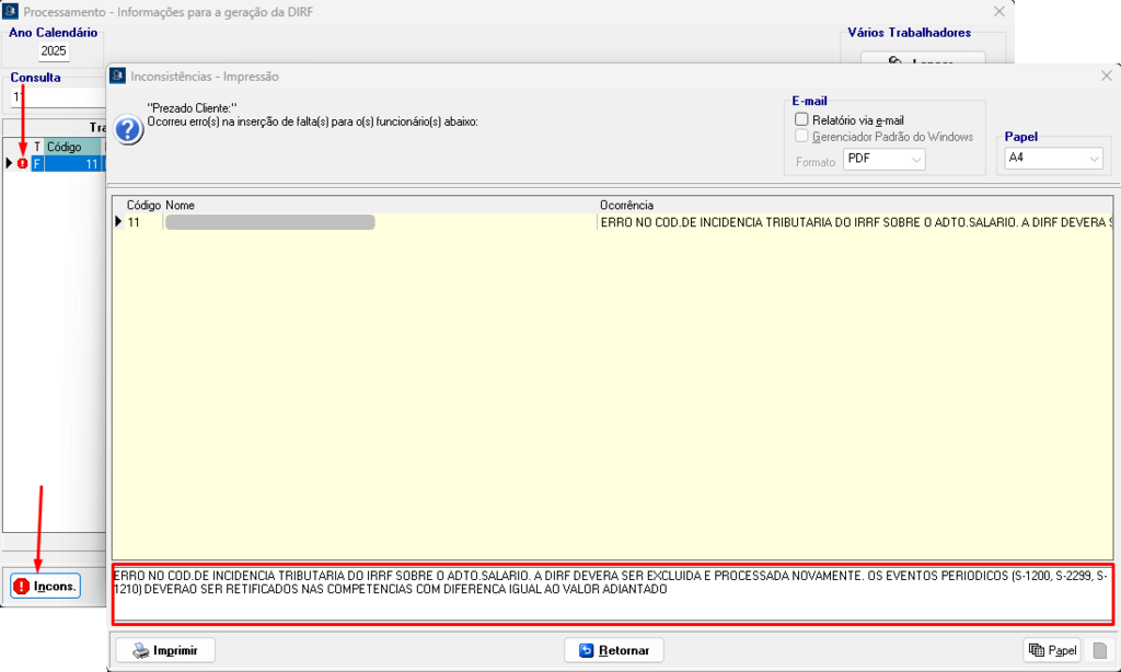 O sistema apresentará a seguinte mensagem na inconsistência da DIRF: