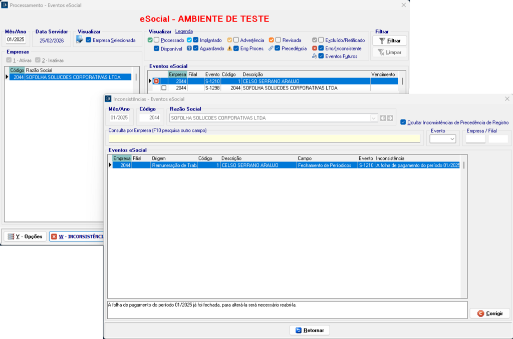 Se o eSocial estiver fechado,será necessário reabrir a folha antes de enviar as retificações.