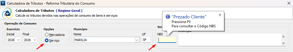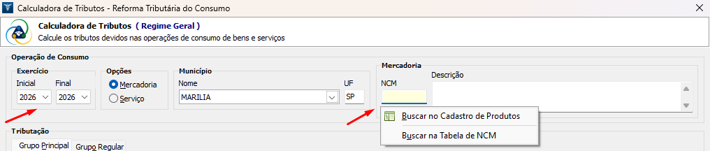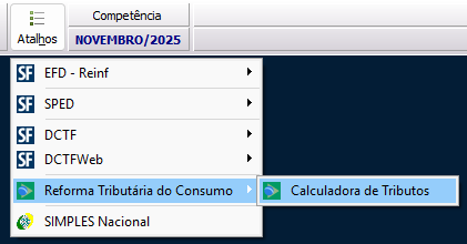 Na tela principal do sistema, acesse o menu Atalhos > Reforma Tributária do Consumo > Calculadora de Tributos.