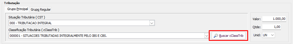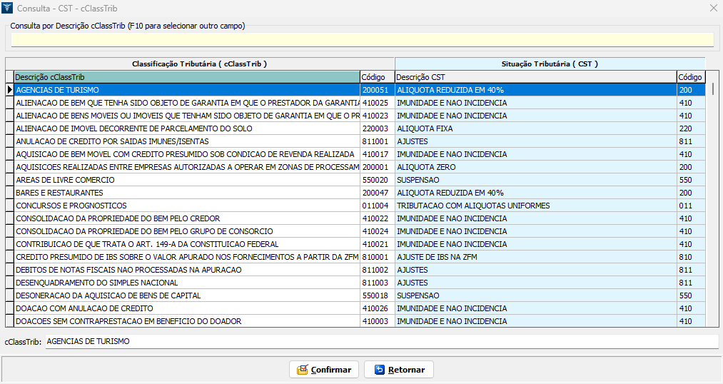 3. Para informação dos códigos de CST x cClassTrib, foi adicionada a Tabela de Relacionamento no sistema para pesquisa (extraída da tabela disponível no site da Receita) tanto para o Grupo Principal quanto para o Grupo Regular. Esse é um grande diferencial em relação à calculadora web da Receita, pois será possível realizar a busca pela descrição tanto do CST quanto da cClassTrib: