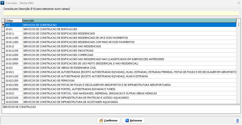 2. Busca por NBS quando selecionada a opção Serviço. Foi adicionada também a Tabela de NBS no sistema para consulta:
