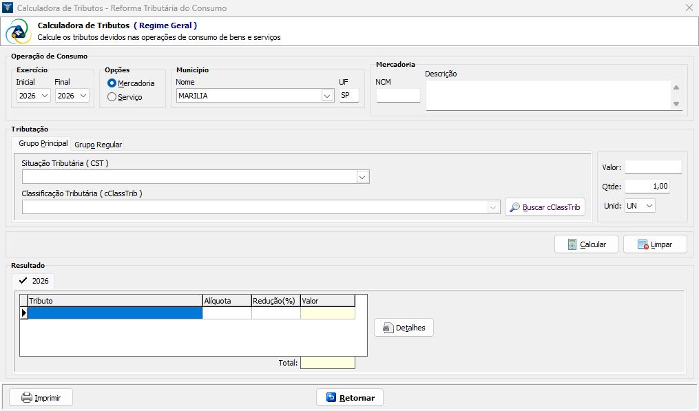 Será exibida a tela principal da Calculadora de Tributos do sistema: